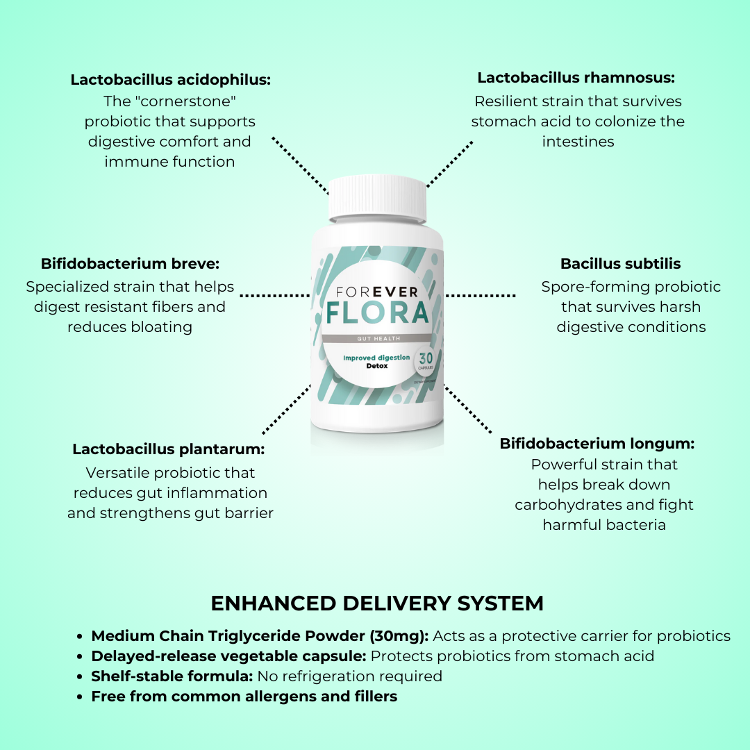 Developed by our team of microbiologists and digestive health specialists, FOREVER FLORA features clinically-studied probiotic strains in their optimal ratios. Our proprietary manufacturing process ensures maximum viability and effectiveness.