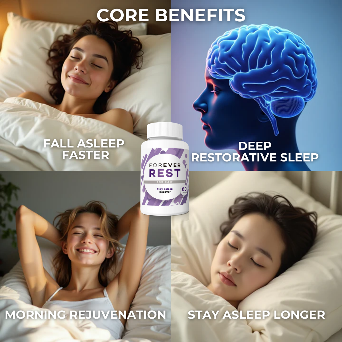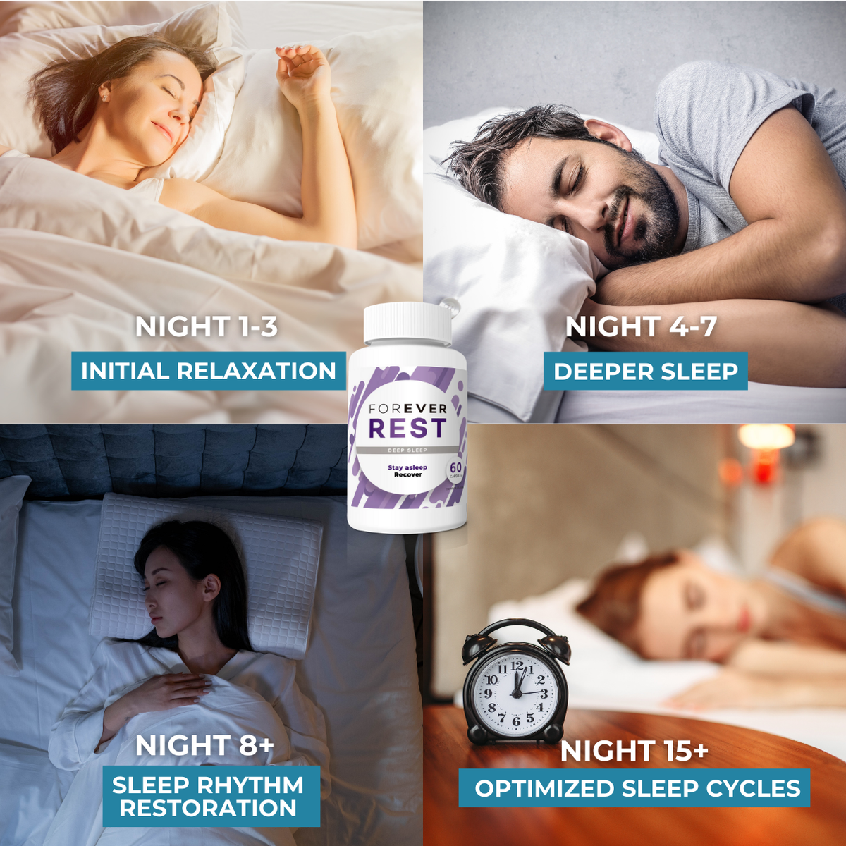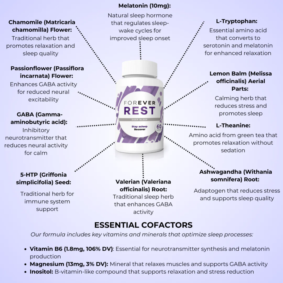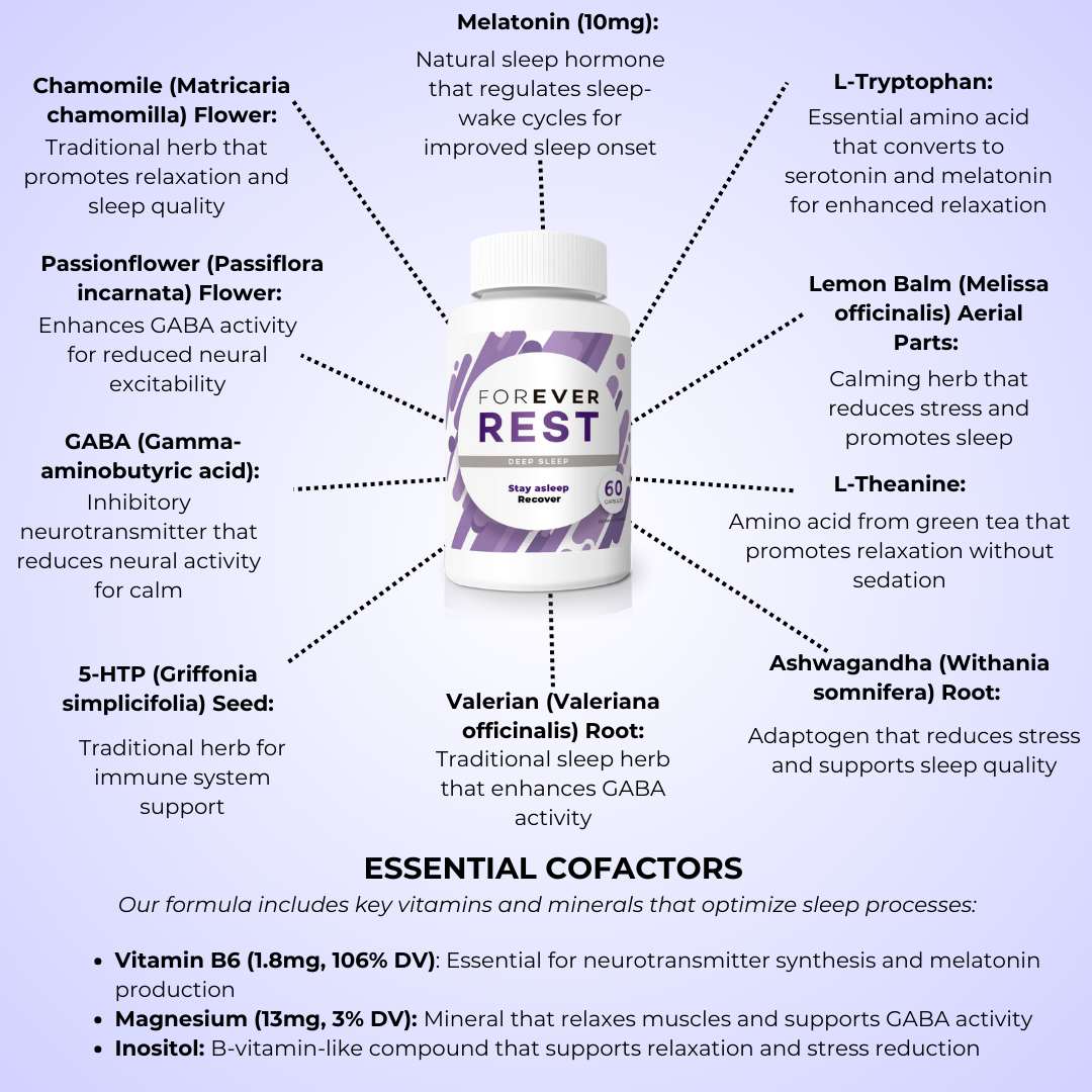 Developed by our team of sleep specialists and neuroscientists, FOREVER REST combines traditional sleep-supporting herbs with modern nutritional science. Our formula is designed to improve sleep quality without the side effects or dependency associated with pharmaceutical sleep aids.
